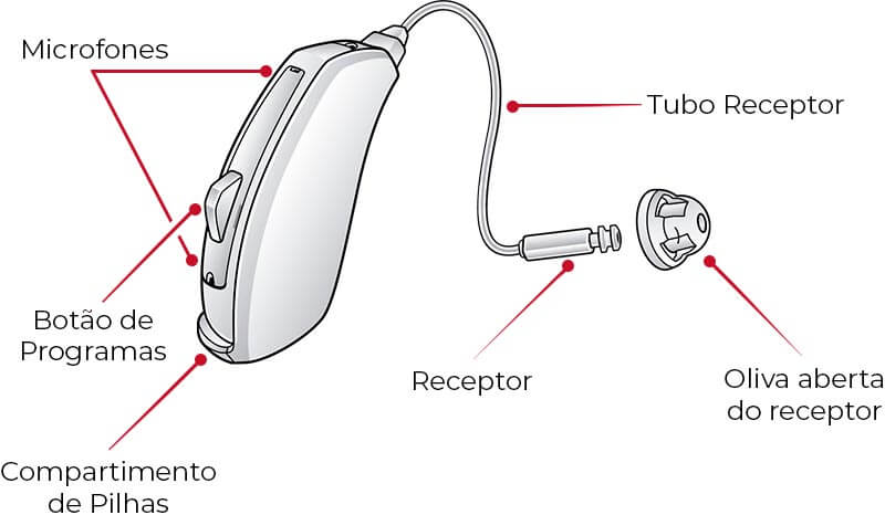 - Tubo receptor: Responsável por levar os sinais sonoros processados para o receptor dentro da orelha.